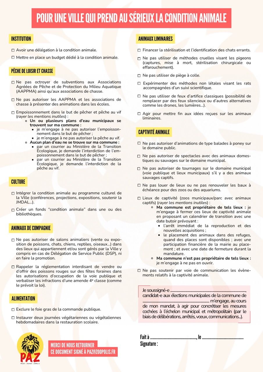 Vous l’aurez compris, les élections municipales sont un rendez-vous à ne pas manquer pour les animaux. C’est pour cela que PAZ a créé une charte spécialement pour ces élections et a un plan d’actions. Le succès de ce plan dépendra de votre mobilisation à nos côtés. Alors rejoignez-nous pour une visio de présentation le mardi 30 septembre à 19h. Je vous expliquerai comment vous pouvez aider PAZ à obtenir des engagements dans votre ville (pas besoin d’être un-e expert-e, nous avons seulement besoin de personnes motivées, nous serons là pour vous aider et vous conseiller !). Pour participer, rendez-vous sur ce lien à l’heure prévue.